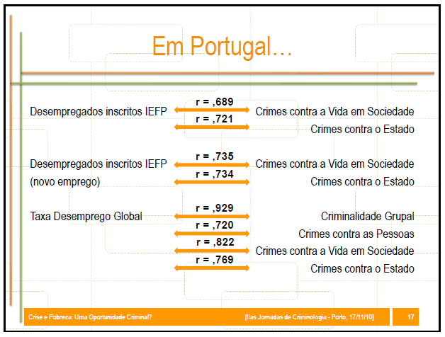 Aliás, na ocasião, apresentei uma pequena análise estatística, tendo por base os dados oficiais da criminalidade e de outras variáveis sócio-económicas, que se traduziram em resultados bastante claros, como é visível no slide que reproduzo aqui.