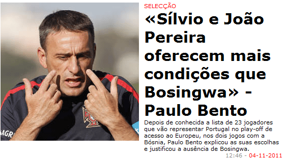 Só assim, jogando com 12 (Sílvio e João Pereira – os dois – no lugar de Bosingwa), compreendo estas declarações de Paulo Bento.