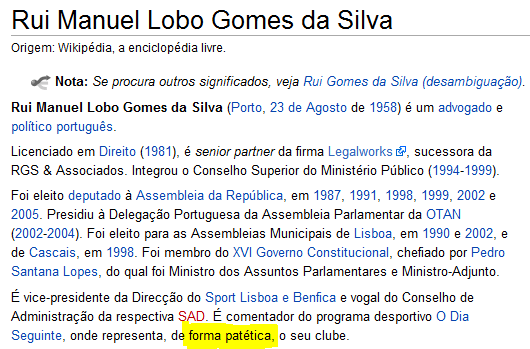 Como não poderia deixar de ser… dei comigo na Wikipédia e na página referente a esse mesmo senhor. Achei curioso a realidade lá exposta. No local onde apresenta as funções que o mesmo já desempenhou, refere que é comentador nesse programa, onde (e cito) “representa, de forma patética, o seu clube”.